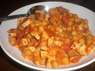 Knoblauch, Zwiebel und Chilischote kleinschneiden, das ganze in etwas Öl in der Pfanne anbraten. Den kleingewürfelten Tofu dazu geben und das ganze mit etwas Paprikapulver bestreuen und braten. Anschließend die Kichererbsen zu fügen und das ganze mit den Tomaten und der Gemüsebrühe ablöschen. Für weitere 5 Min. köcheln lassen und mit Salz, Paprika, Chili abschmecken. Den Koriander kleinhacken und zufügen.
