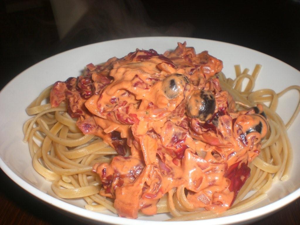 Linguine in Salzwasser kochen, Butter in einer Pfanne zerlassen und kleingeschnittene Zwiebel, Knobizehe und Chilischote darin leicht anbraten. Radicchio zufügen und mitbraten. Schmand in der gleichen Pfanne schmelzen, mit 2 EL Tomatenmark, Salz, Pfeffer und etwas Zucker würzen, Oliven dazu geben und alles nochmal durchschwenken, bis die Nudeln fertig sind… thats it!