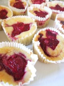 Für die Käsecreme den Frischkäse mit Zucker verrühren, die Eier einzeln hinzufügen und dann das Vanille-Aroma zugeben.Gleichmäßig in die Förmchen über die Himbeeren gießen.