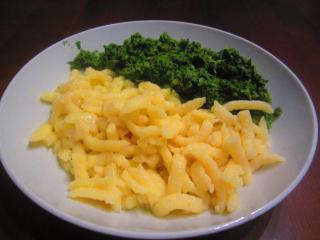Dann gehts eigentlich recht fix: Grünkohl mit der Brühe gar kochen, die Brühe anschließend abgießen und Salz, Pfeffer, Kümmel zufügen. Ca. 1/2 Becher Sahne aufgießen und leicht einköcheln lassen. Spätzle nach Packungsanleitung in Salzwasser kochen, abseihen und mit beliebiger Menge Parmesan mischen.