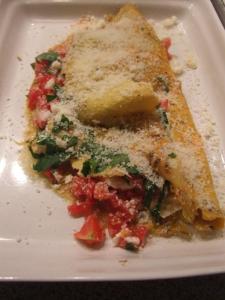 Die Butter in der Pfanne zerlassen, die drei Eier verquirlen, mit den Gewürzen vermengen und in diePfanne geben. Die Hitze runterschalten und die Eimasse langsam stocken lassen – nicht wenden! – das Ei wird nur von einer Seite gegart. Mit dem Löffelrücken immer wieder oben die restliche Flüssigkeit verteilen. Wenn das Ei gut durch ist, Tomaten-, Schafskäsewürfel und gehackte Petersilie auf die eine Hälfte verteilen und die andere Hälfte überklappen. Das zugeklappte Omelette mit Parmesan bestreuen, in eine Auflaufform geben und im Ofen schön goldgelb überbacken.