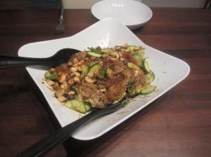 In einer Pfanne 2 EL Öl erhitzen und Cashews in ca. 1 Min unter ständigem Wenden goldbraun rösten. Herausnehmen und eingeweichte Glasnudeln abgießen, etwas kleiner schneiden und in der Pfanne kurz erwärmen. Aus der Pfanne nehmen und mit Gurke, Koriander, Ingwer, Knoblauch und Chili in eine Schüssel geben. Mit Sojasauce, Sesamöl, Salz un Zucker marinieren. Den Tofu mit etwas Öl in einer Pfanne erhitzen und leicht bräunen. Auf den Salat geben.