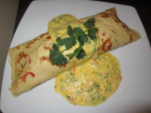 Vermischen und mit etwas Butter in der Pfanne braten, wenn eine Seite gut gebräunt ist, schwungvoll mit der Pfanne wedeln und den Pfannkuchen rumdrehen.