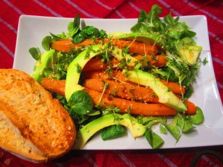 Feldsalat anrichten und die Avocado in dünnen Scheiben drauflegen. Die fertigen Möhren dazugeben und mit einer Küchenzange die Orange und Zitrone in ein Gefäß auspressen, die selbe Menge an Olivenöl und Weißweinessig zugeben und mit Salz und Pfeffer abschmecken. Das Dressing über den Salat geben und den Teller mit etwas Kresse und geröstetem Sesam garnieren. Dazu gabs zwei Scheiben getoastetes Ciabatta.
