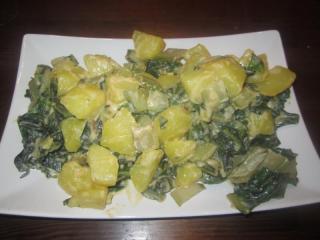 Die Kartoffeln werden geschält und zerkleinert und anschließend in reichlich Salzwasser gar gekocht. Derweil die Zwiebeln in der Pfanne mit etwas Öl anbraten, den klein geschnittenen Mangold hinzufügen und anbraten. Wenn die Kartoffeln gar sind, etwas von dem Kartoffelwasser zum Mangold geben und die Kartoffeln dann abgießen. Anschließen in die Pfanne geben, mit etwas Sahne aufgießen und den Schafskäse schmelzen lassen. Das ganze noch nach Belieben abschmecken und fertige ist ein sehr leckeres, schnelles Abendessen.