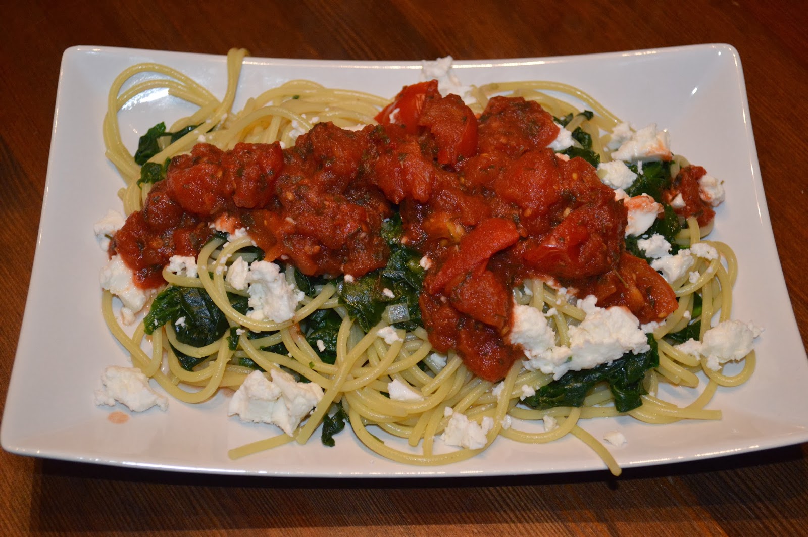 Spaghetti, Spinat und Tomatensauce auf dem Teller anrichten und Feta rüberbröseln. Lecker!