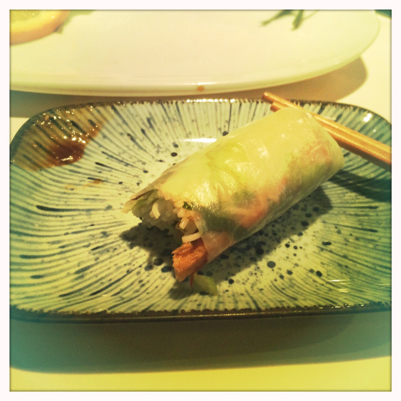 Das Restaurant hat ein schönes Ambiente und sehr freundliches und zuvorkommendes Personal. Wir haben uns gleich wohl gefühlt. Es war recht voll und reservieren ist zwingend erforderlich. Einziges Manko – die Tische stehen recht eng und ich mag es nicht besonders, wenn ich mehr vom Gespräch der Tischnachbarn mitbekomme, als von meinem eigenen Gesprächspartner. Als Vorspeise haben wir uns einmal Glücksrollen mit Tofu geteilt. Die waren sehr lecker.