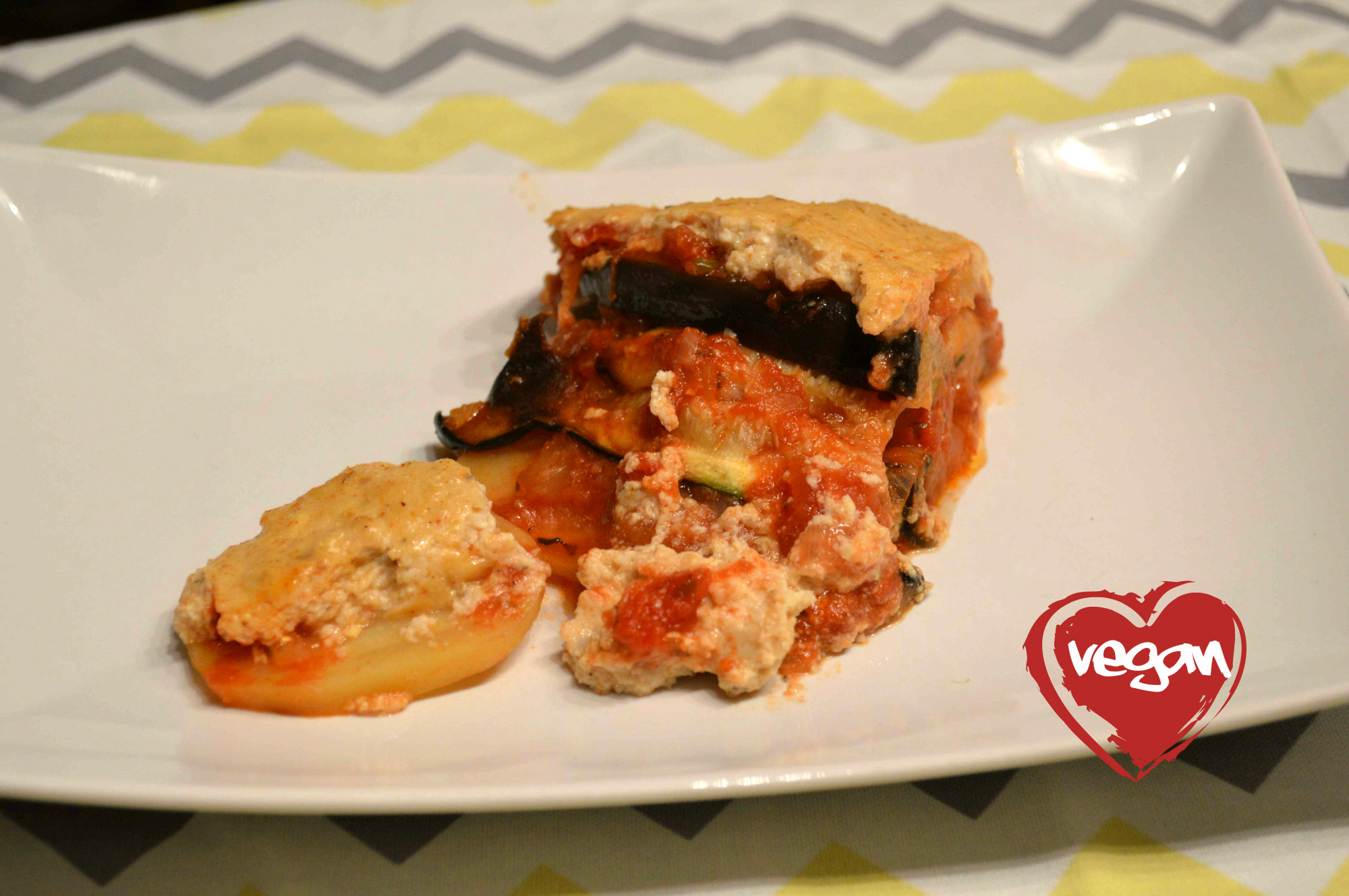 Aus dem Seidentofu, den Pinienkernen, 30 ml Zitronensaft und den Gewürzen eine cremige Masse pürieren und diese zum Schluss über die Moussaka geben. Das ganze dann nochmals ca. 30-40 Min. in den Ofen, bis die Tofu-Masse eine leichte Bräunung hat.