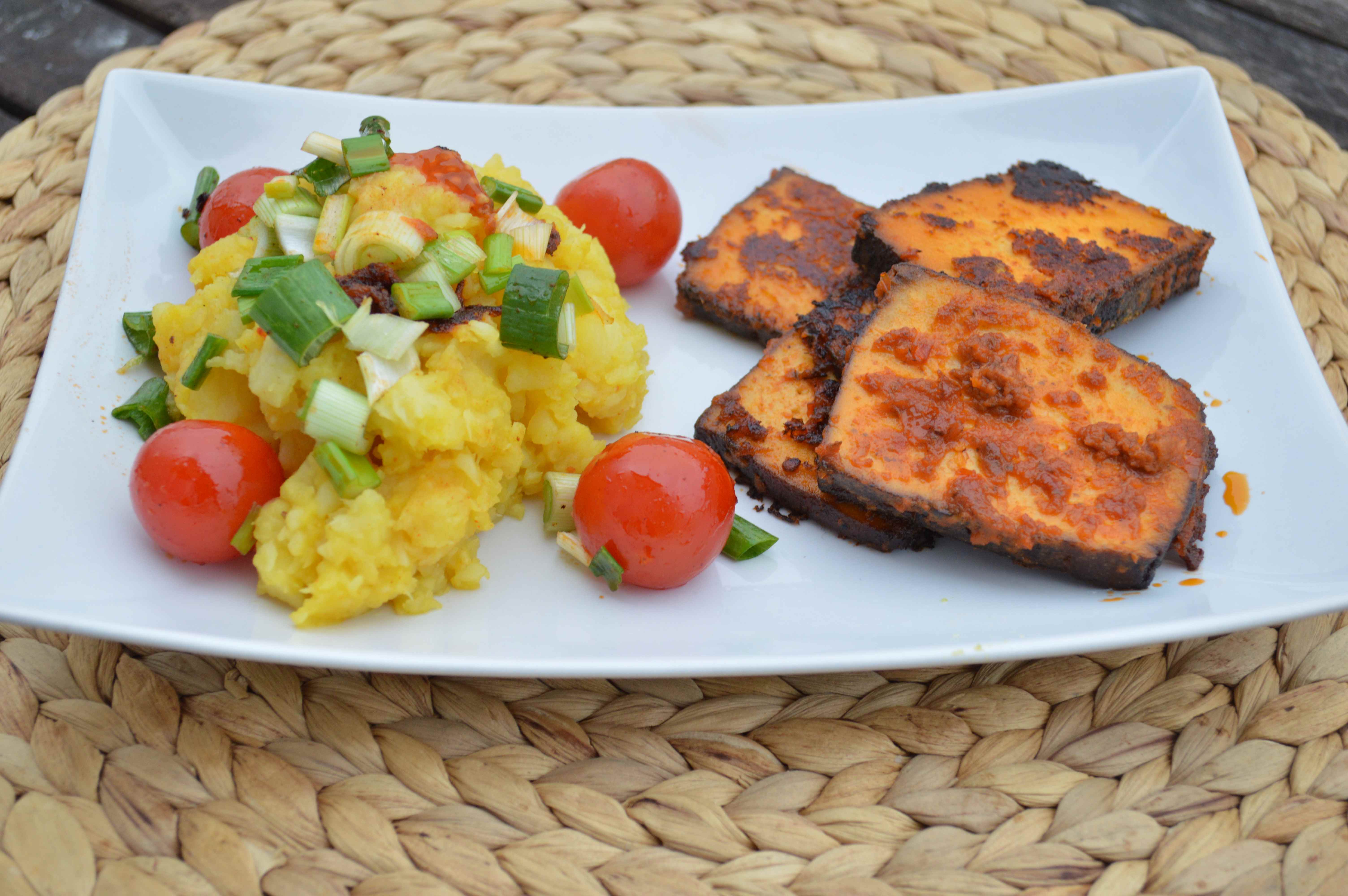 Den Tofu in einer Pfanne ohne zusätzliches Fett von beiden Seiten anbraten. Wenn die Kartoffeln und die Pastinake weich sind, diese pürieren (ich mags lieber etwas grober und nicht so cremig) und mit Salz, Pfeffer, Chili und etwas Kurkuma abschmecken.