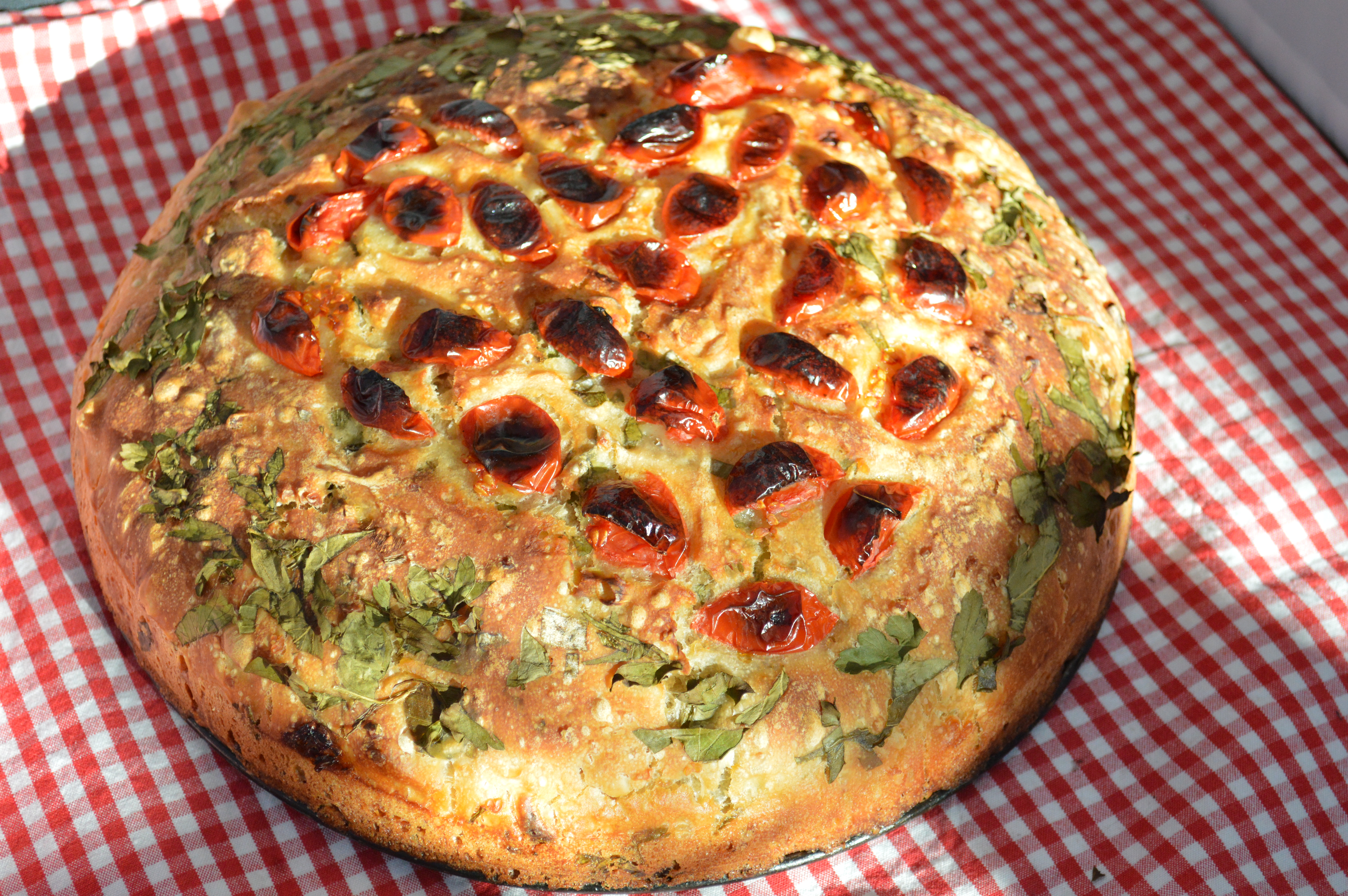 In eine gefettete Springform geben und dekorieren mit gehacktem Basilikum und Petersilie sowie Cocktailtomaten. Diese je nach Größe vierteln oder halbieren und ggf. den Saft auslassen, damit es nicht aufs Brot nässt. Für ca. 40 Min. im Ofen bei 200 Grad Ober/Unterhitze backen. Bei mir hats bissl länger gedauert.
