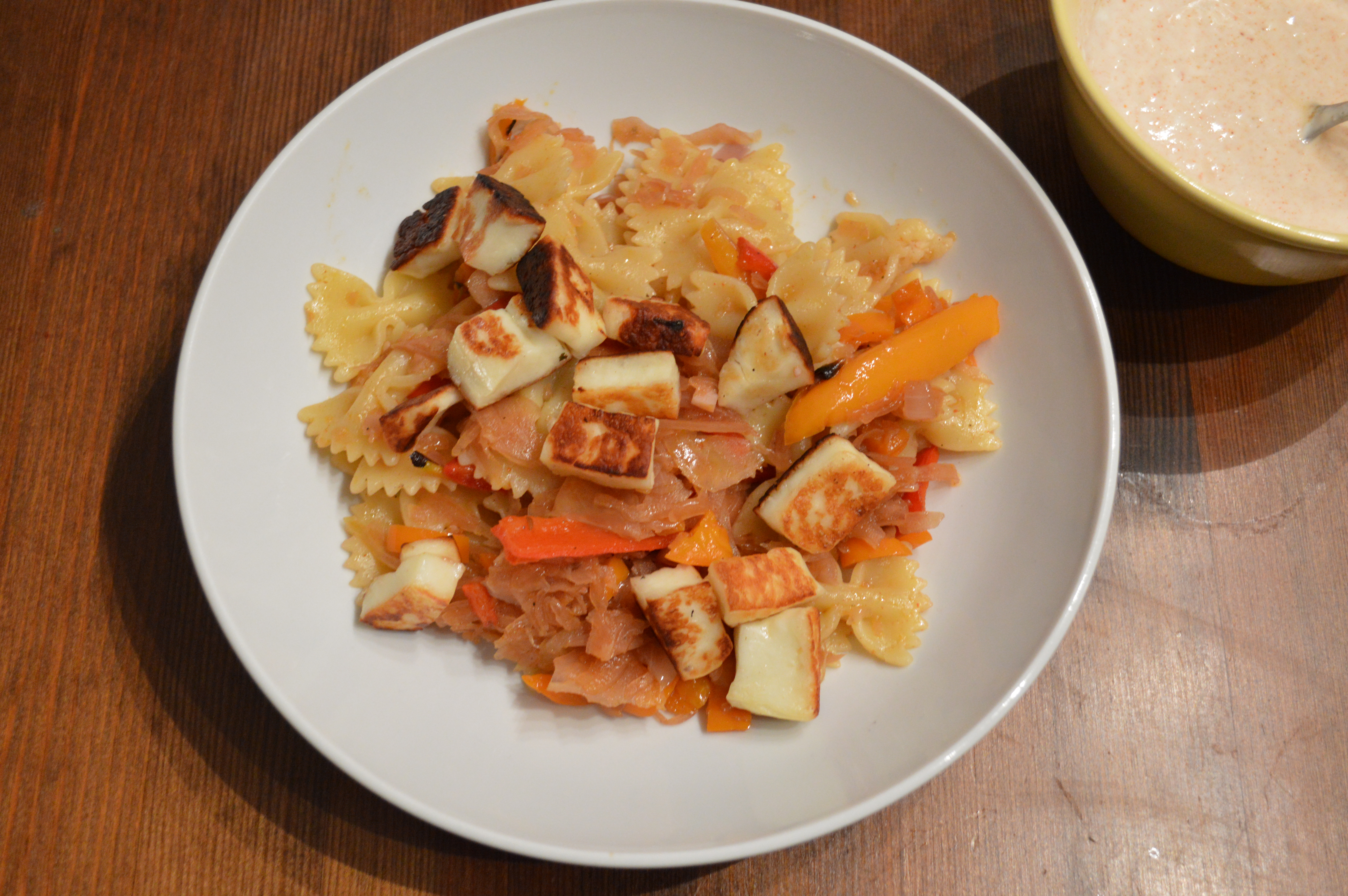 1/2 Zwiebeln in Würfeln in etwas Butter anbraten. 2 Paprikaschoten würfeln und mit Paprika, Chili, Kümmel und einem Lorbeerblatt zugeben. Mit ca. 50 ml Rotwein und etwas Wasser ablöschen. Dann 300 g Sauerkraut zugeben und mit Salz, Pfeffer, Majoran und geriebener Zitronenschale würzen. 2 EL Olivenöl, 1 EL Weißweinessig und eine gehackte Knobizehe zugeben. Das ganze 15 Min. köcheln lassen bei geschlossenem Deckel. In der Zwischenzeit Nudeln oder Kartoffeln kochen und in einer weiteren Pfanne den Halloumi goldbraun braten (da hab ich es etwas übertrieben 😉 )