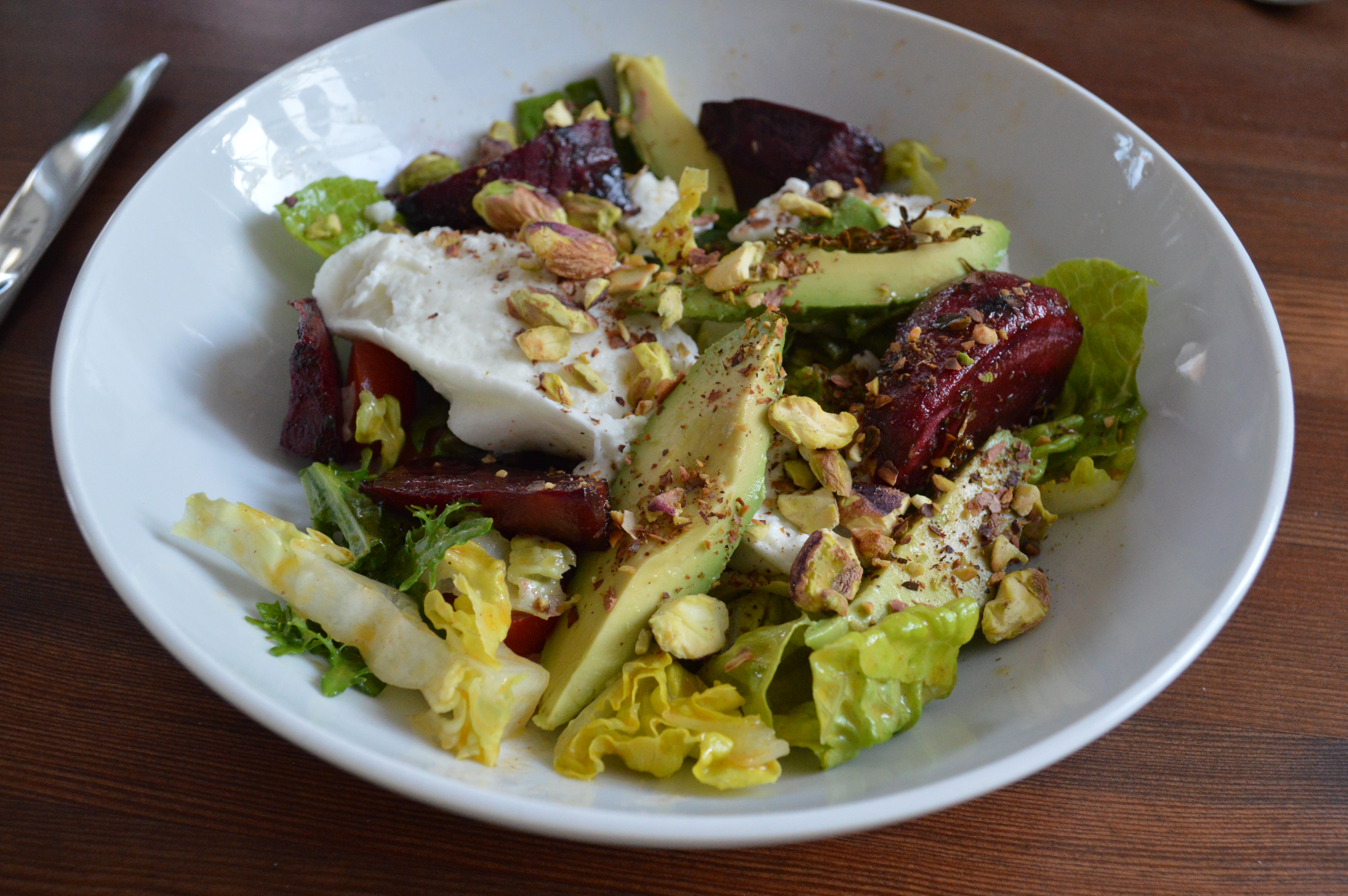Als Vorspeise gab es einen schönen bunten Salat. Dieser bestand aus einer Asiasalatmischung und einem Römersalatherz. Getoppt wurde dies dann mit Büffelmozzarella, gerösteten Pistazien, kleinen Tomaten, Avocadovierteln und Rote Beete Schnitzen, die ich mit Thymian, Estragon und Oregano und etwas Öl im Ofen für 30 Min. gegart habe.