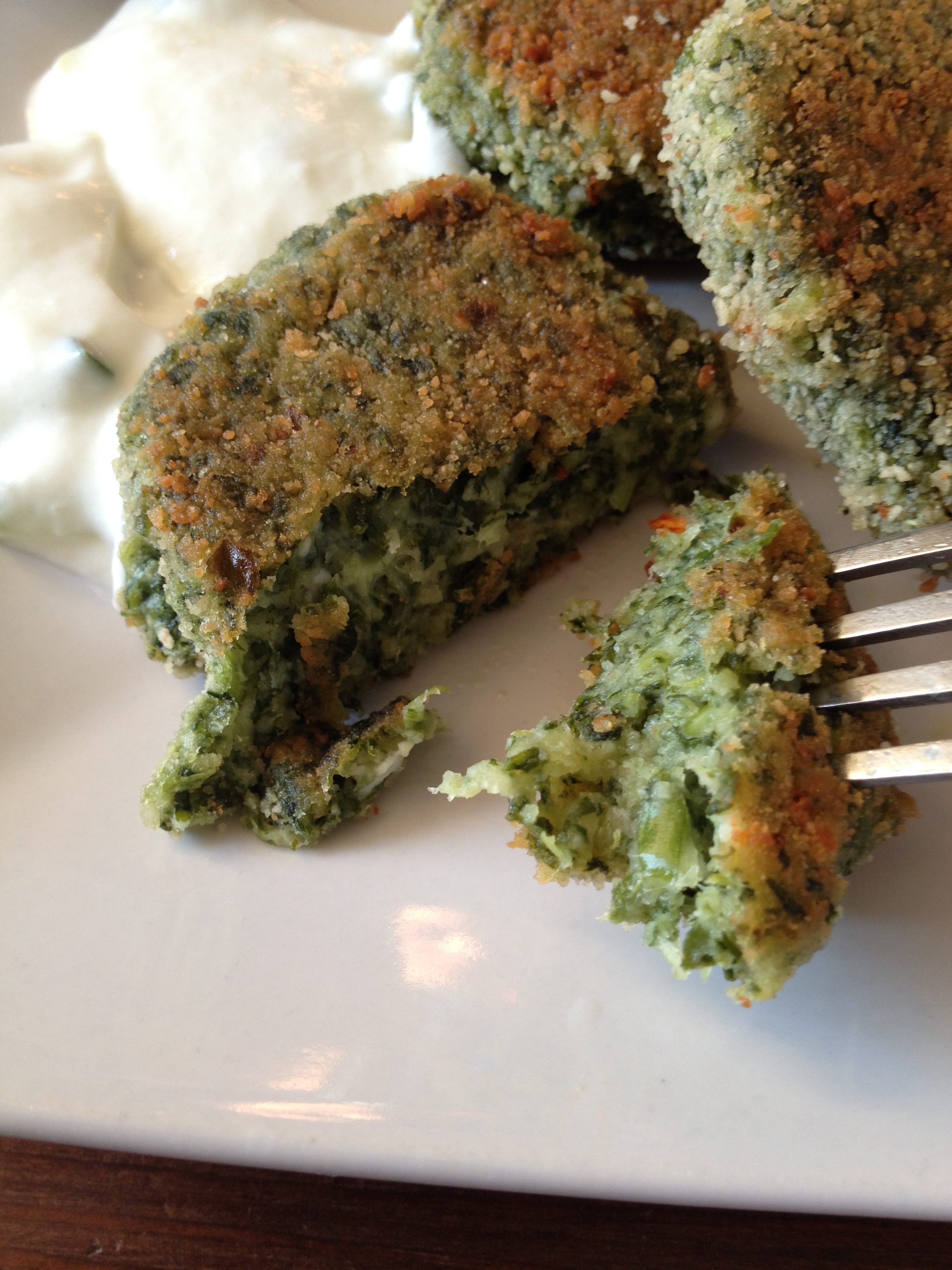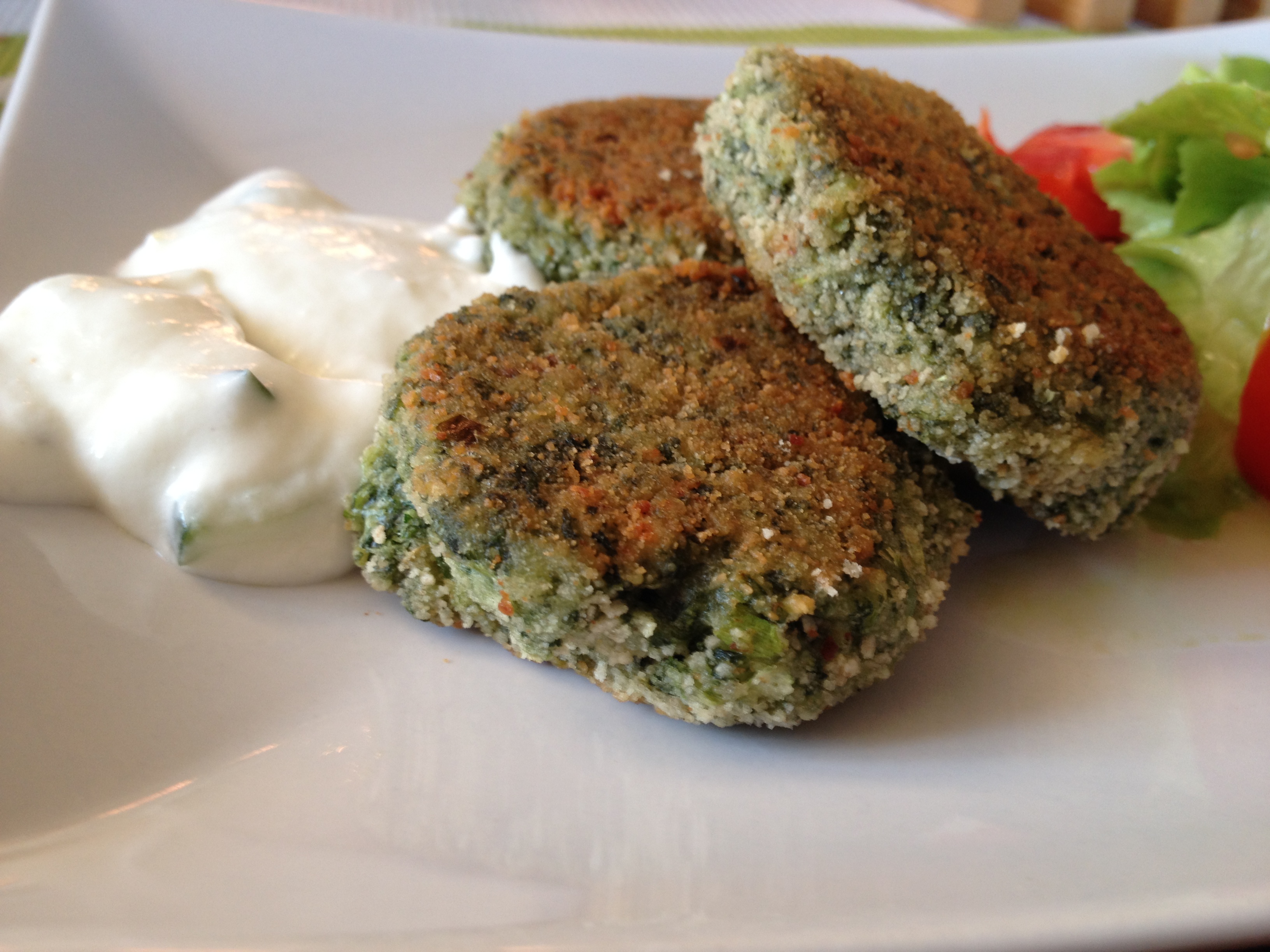 Spinat in die Küchenmaschine geben, die restlichen Zutaten ebenfalls. Dann ein paar Mal pulsen und keinesfalls wie ich ne ganze Minute auf Vollspeed laufen lassen, das ergab nämlich ziemlich cremige Konsistenz. Ich musste dann mit Paniermehl nachhelfen, damit ich eine Konsistenz erreichte, bei der ich die Fritters noch ausbacken konnte. Kleine Bällchen formen und diese von beiden Seiten in Paniermehl wenden und dann auf beiden Seiten in Öl in der Pfanne ausbacken.