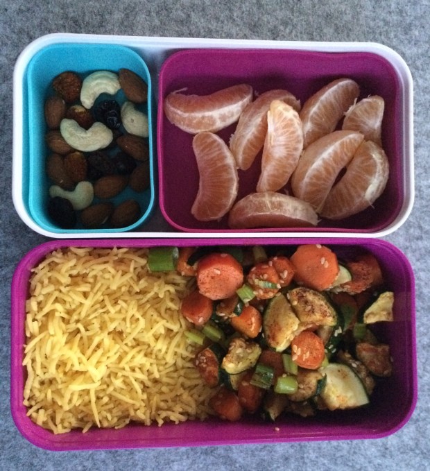 Reis-Reste vom indischen Lieferdienst mit Pfannengemüse, Mandarine und Nüssen