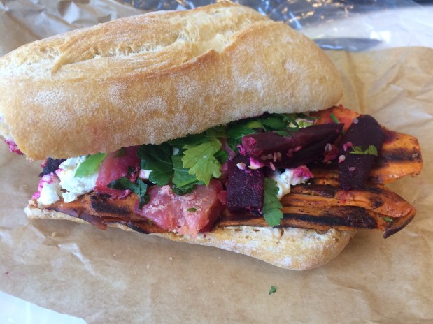 Wir haben das Gemüse nicht ganz geschafft. Da kam uns eine – wie sich später herausstellte, ganz wunderbare Idee. Wir haben die Reste um ein paar gebratene Scheiben Süßkartoffel und etwas Fetakäse ergänzt und uns daraus ein Sandwich gebastelt, welches wir nächsten Tag im Büro zum Mittag hatten. Dazu haben wir den Rest Dipp einfach auf das Baguettebrötchen gestrichen und dieses mit der Süßkartoffel und dem restlichen Gemüse belegt, etwas Feta und viel frische Petersilie drüber gegeben. Das war mega-lecker und hätte in einem Münchner Hipster Sandwich-Laden sicherlich 8 EUR gekostet.