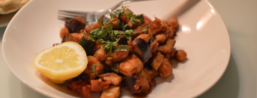 In einer Pfanne etwas Öl erhitzen und Zucchini und Aubergine darin mit etwas Salz anbraten. Wenn beide Gemüse leicht gebräunt sind, diese aus der Pfanne nehmen und beiseitestellen. Dann die Pfanne wieder erhitzen mit etwas Öl, Zwiebeln, Knoblauch, Kichererbsen und die Dose Tomaten aufgießen und mit Salz, Pfeffer, Chili, jede Menge Paprika und etwas Harrissa würzen. Etwas von dem Zitronensaft zufügen, aber dabei aufpassen und zwischendurch lieber mal abschmecken. Das ganze etwas einköcheln lassen und ein paar Spritzer Flüssigrauch zufügen. Dann das Gemüse wieder unterrühren und alles auf kleiner Flamme vor sich hin köcheln lassen.