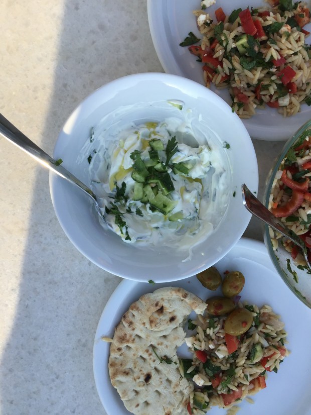 In unserem Naxos-Kochkurs, über den ich später berichten werden, haben wir auch ein tolles Rezept für selbstgemachten Tzaziki bekomme. Geht auch total einfach und schnell. Wenn man aber keine große Lust hat, länger in der Küche zu stehen, tut es auch gekaufter, da gibt es ja durchaus auch immer gute.