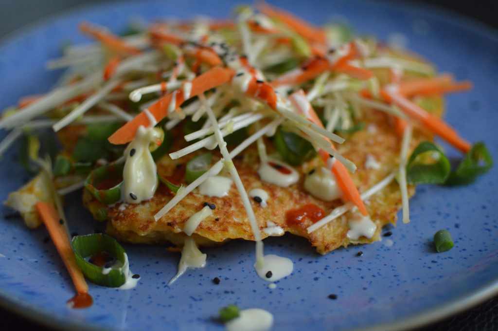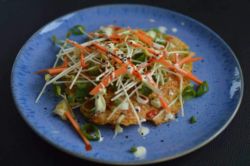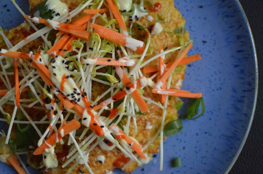 Okonomiyaki stammt aus der Region Osaka und ist eine Art herzhafter Pancake, der gern auch mal japanische Pizza genannt wird, weil man ihn mit verschiedenen Zutaten einfach total vielfältig abwandeln kann. Original wird der Okonomiyaki auf einem Teppan, einer heißen Eisenplatte auf dem Tisch zubereitet. Aber in einer Pfanne geht es auf jeden Fall auch 🙂