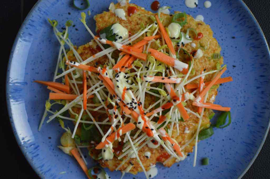 Wenn der Okonomiyaki von beiden Seiten gebräunt ist, diesen auf einen Teller geben. Die Karottenstifte und die Sprossen drüber geben. Etwas Mayonnaise und Sriracha-Sauce über den Okonomiyaki geben und zum Schluss mit etwas schwarzem Sesam bestreuen.