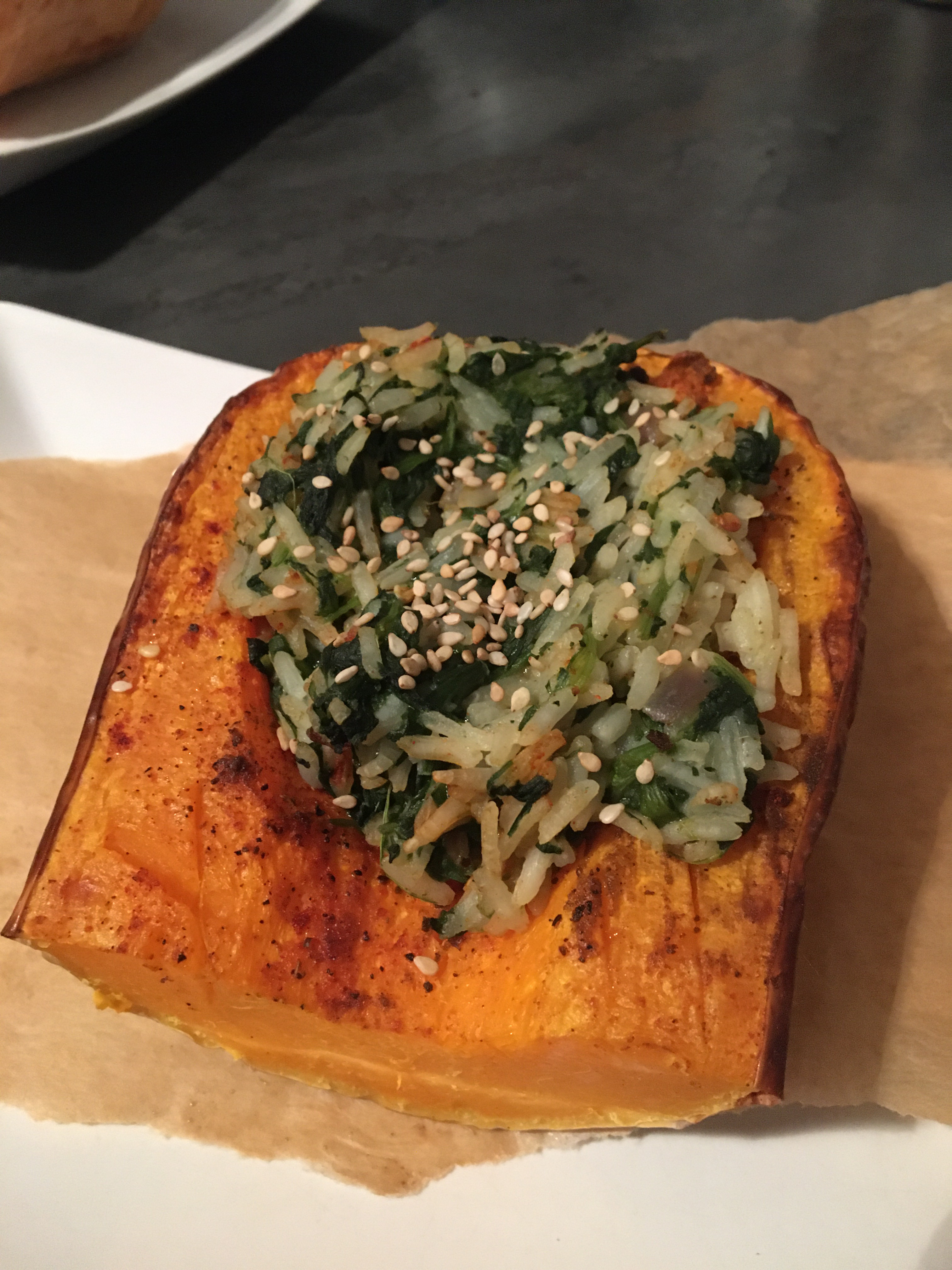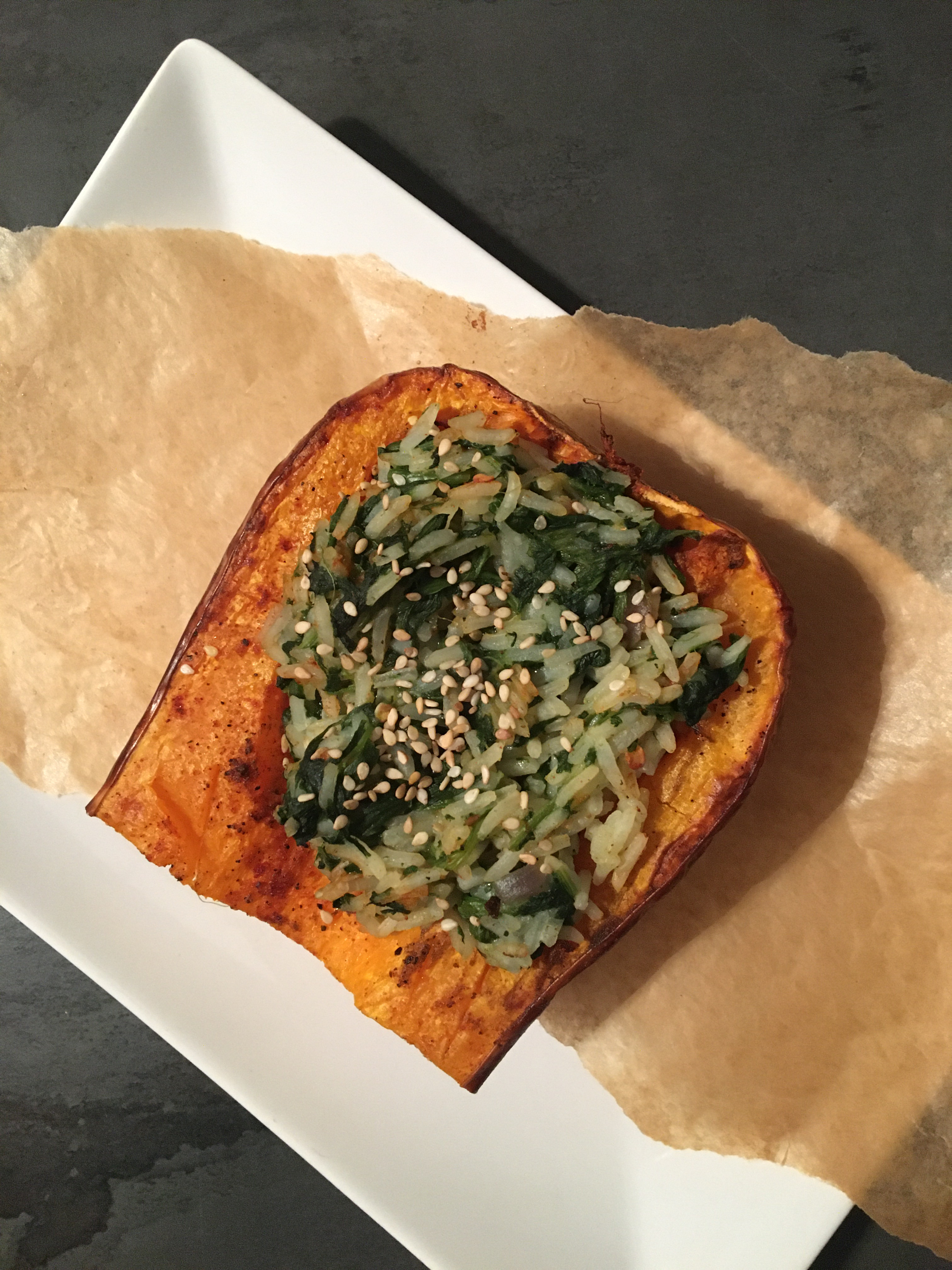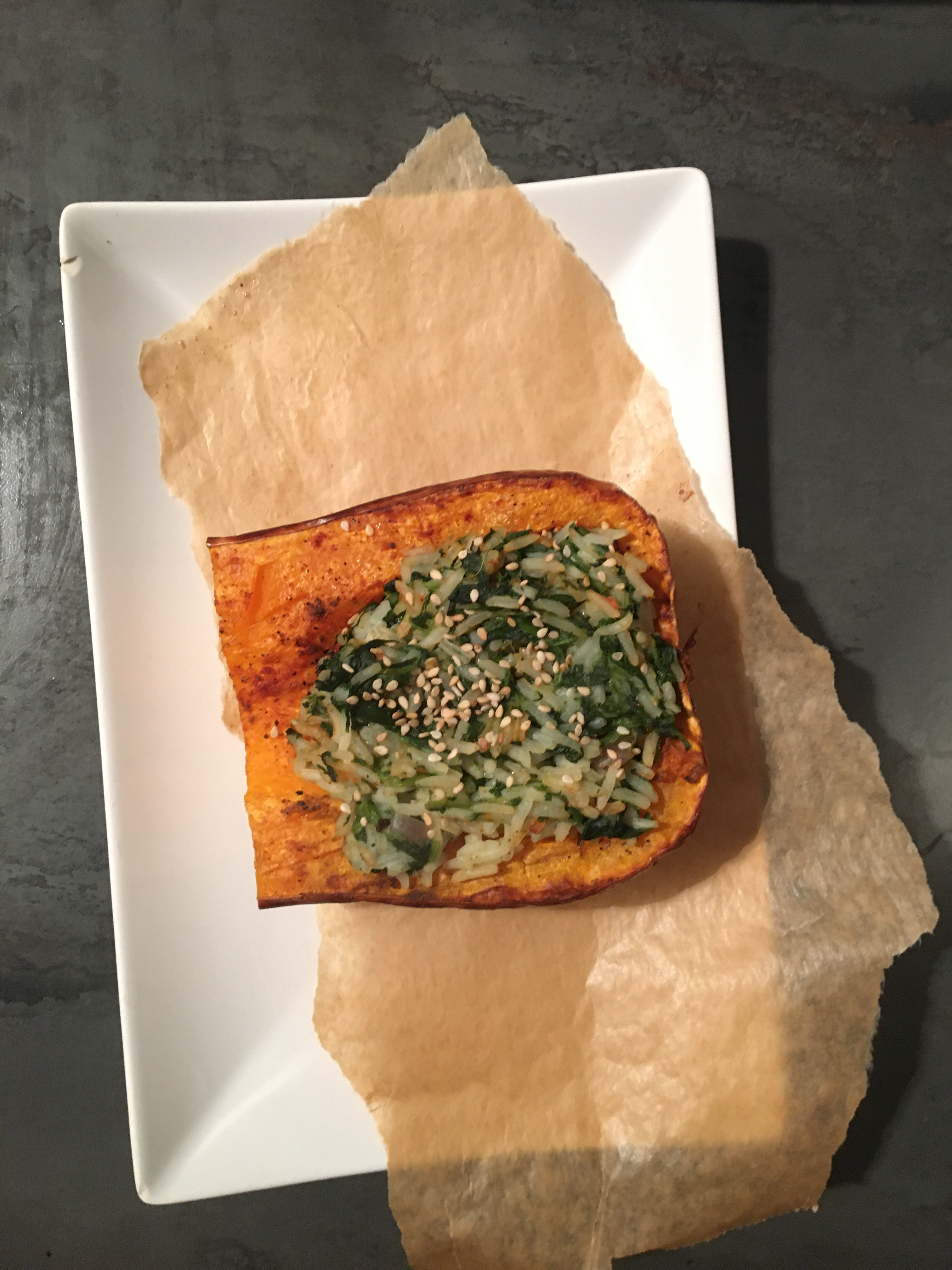 Wenn Spinat und Reis fertig sind, diese mischen und mit Salz würzen. In die Mulden des Kürbisses füllen und nochmal für 5-10 Min. in den Ofen schieben, je nach Gargrad des Kürbisses. Vor dem Servieren noch mit etwas Sesam bestreuen.