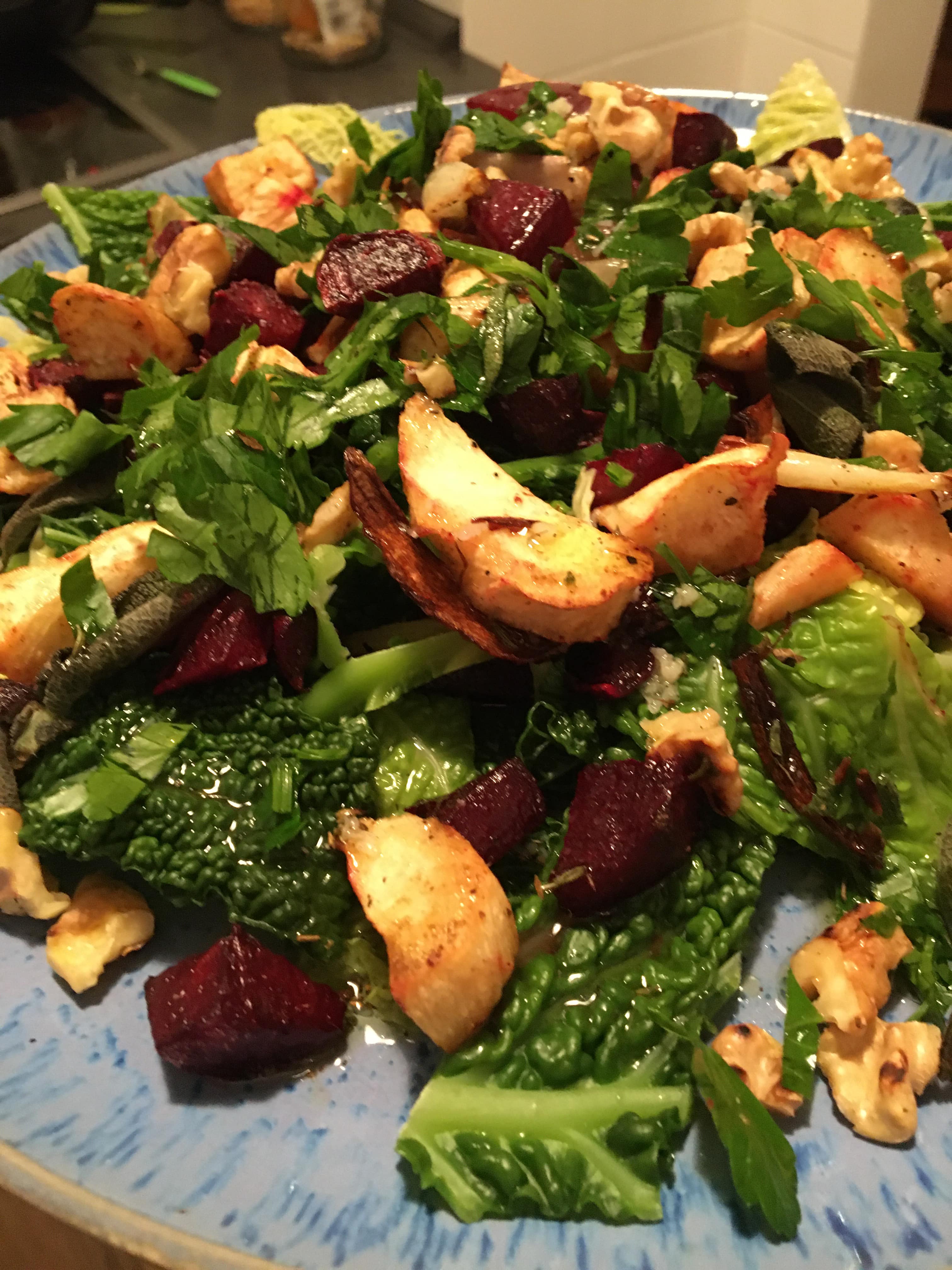 Wenn das Gemüse gar ist, die Knoblauchzehen entfernen und den weichen Knoblauch mit den Zutaten fürs Dressing vermengen. Kräuter und Wirsing mit dem Gemüse vermengen und das Dressing sowie die Walnüsse drüber geben. Fertig ist euer warmer Wintersalat, der euch schön satt macht, lecker ist und gut ausschaut.