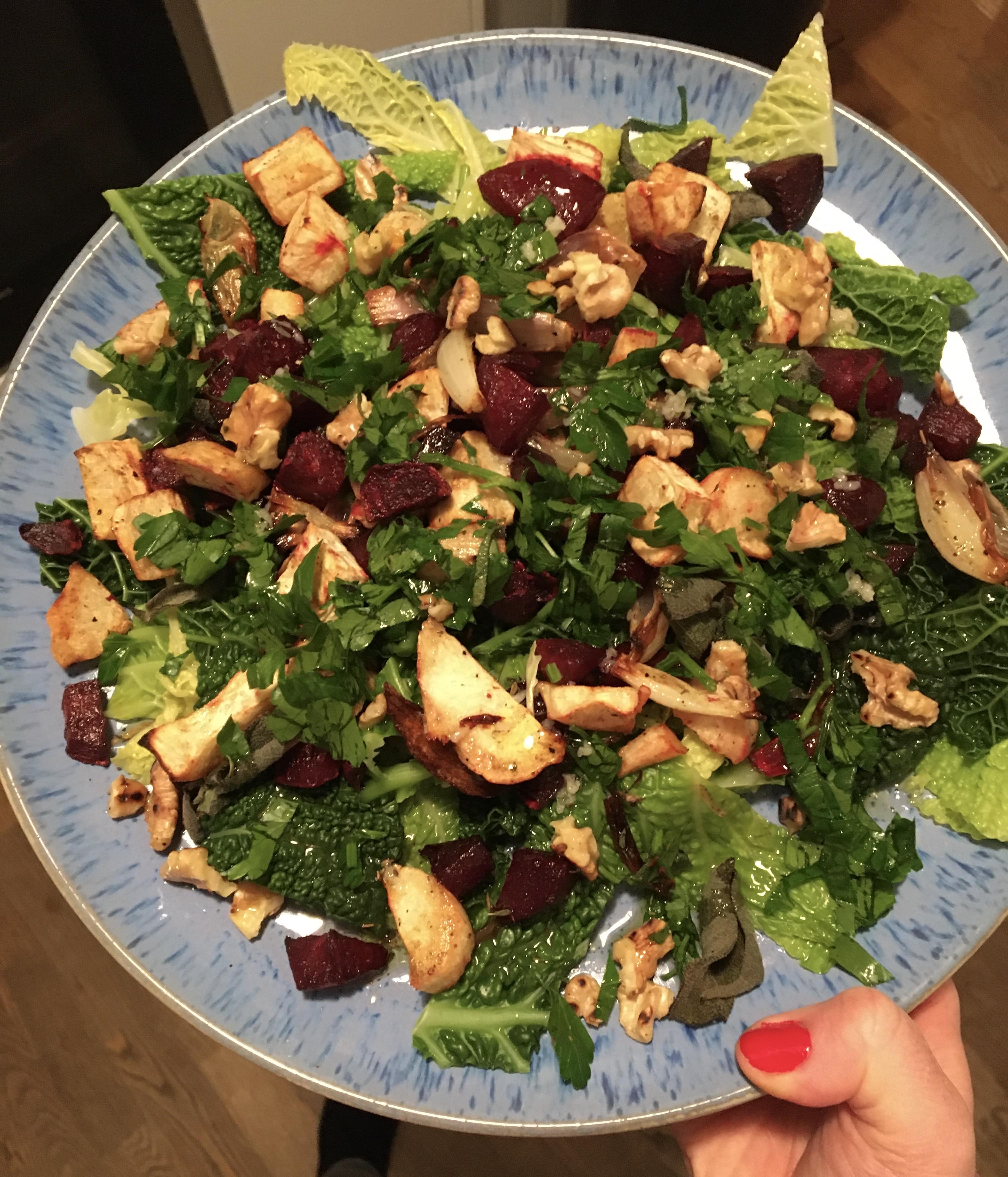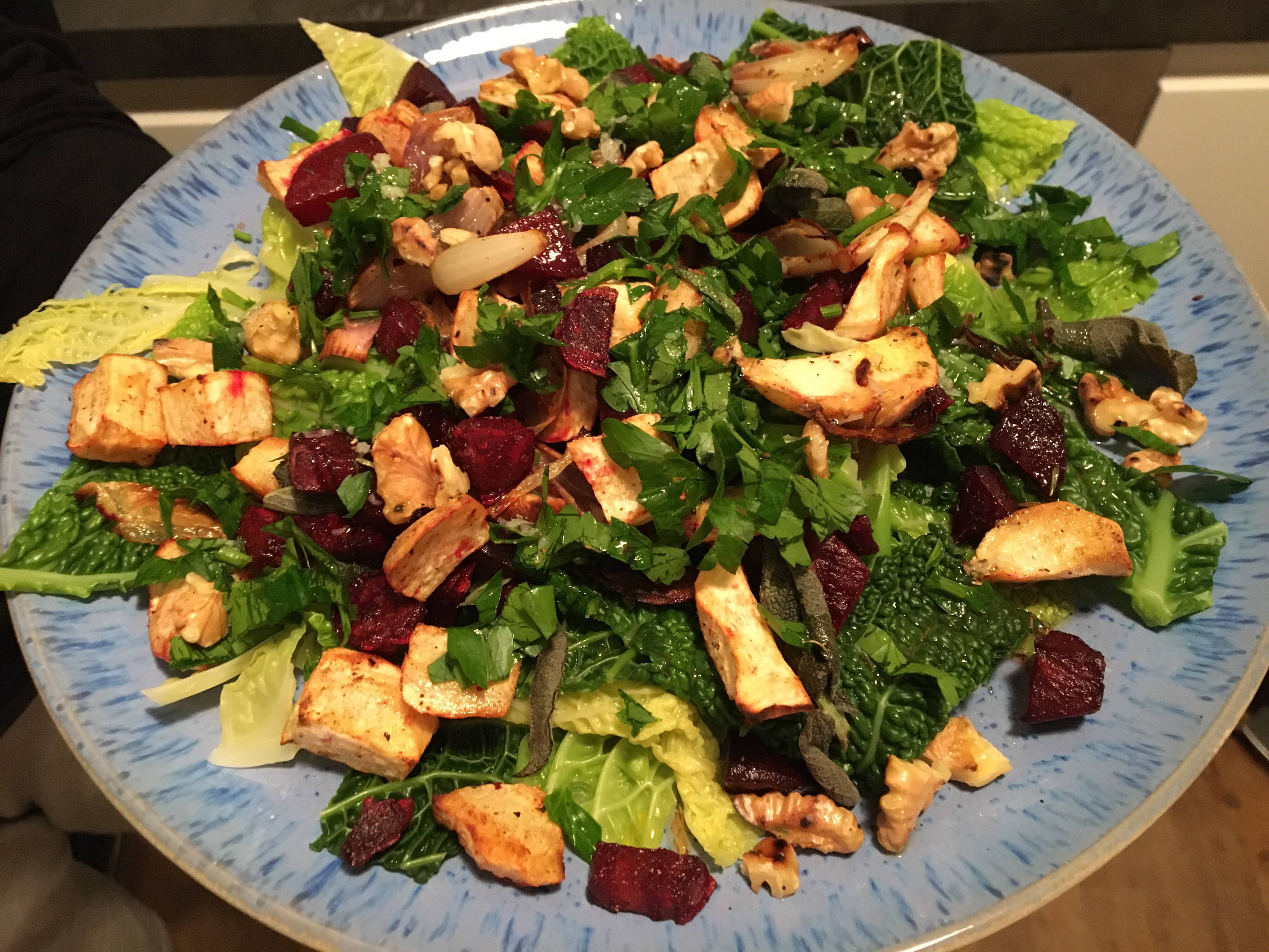 Dieser Wintersalat entstand aus einem Überfluss an Gemüse, die wir einfach zusammengeschmissen haben und daraus einen warmen Salat gebastelt haben. Das war mega lecker und hat direkt eine gute Menge an Gemüse verarbeitet, wenn man grad mal zuviel hat.