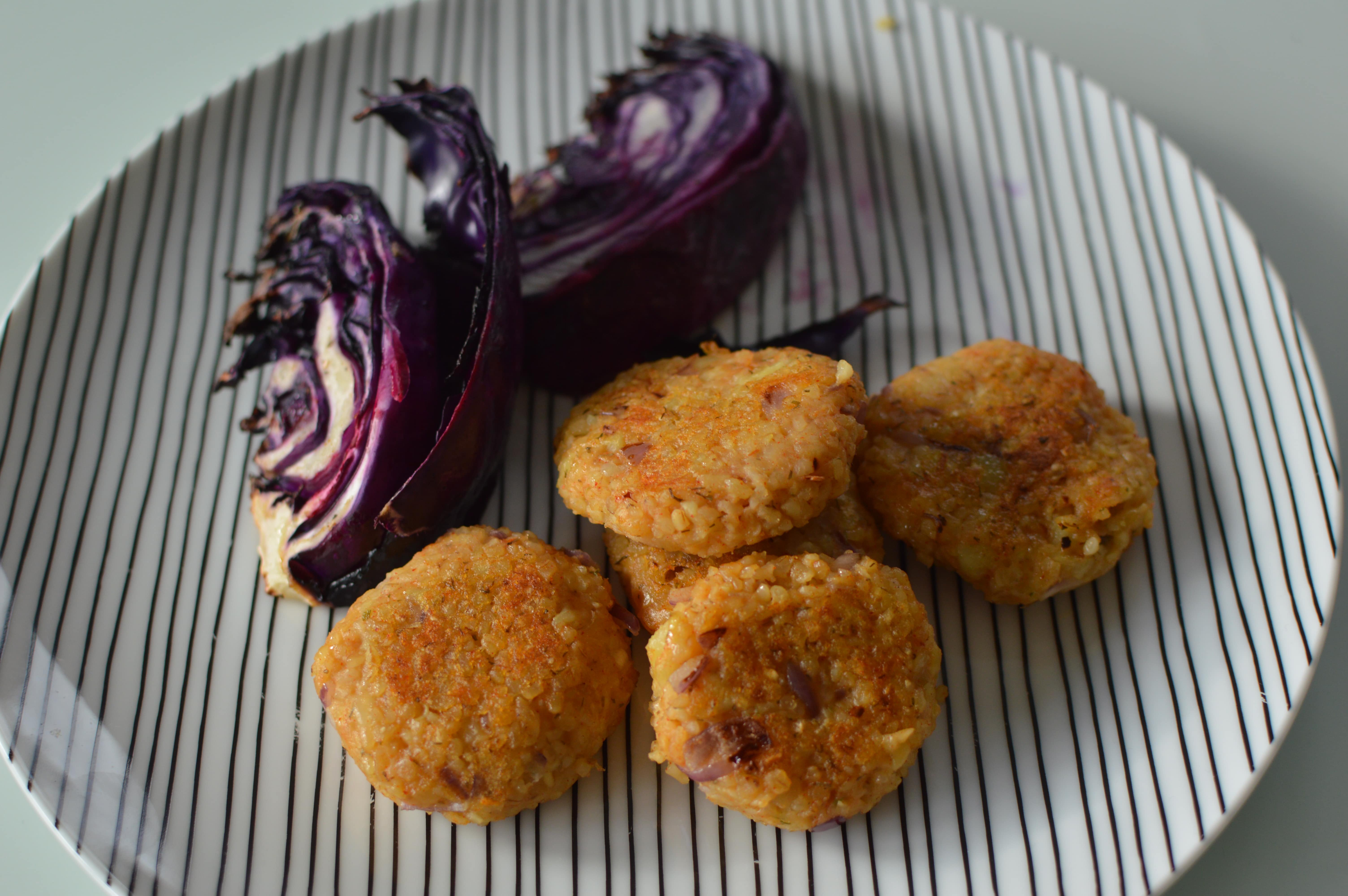 Unsere Gemüsekiste enthielt in letzter Zeit viel frischen Rotkohl und auch immer wieder Kartoffeln, so dass ich mich schließlich für Stephies Kartoffel-Couscous-Bratlinge entschied und dazu gebackene Rotkohlspalten servierte. Die Rotkohlspalten waren aus einem Kochbuch, die waren aber nichts für „schnell mal Mittags was kochen“, denn sie haben ewig gebraucht im Ofen und waren dann immer noch sehr bissfest. Daher gibts für die jetzt auch kein Rezept.