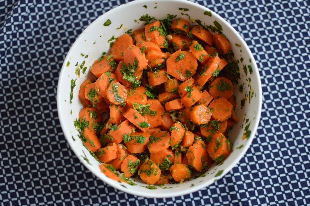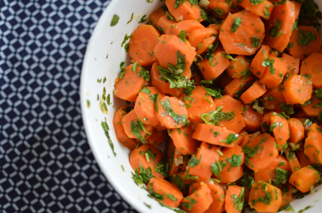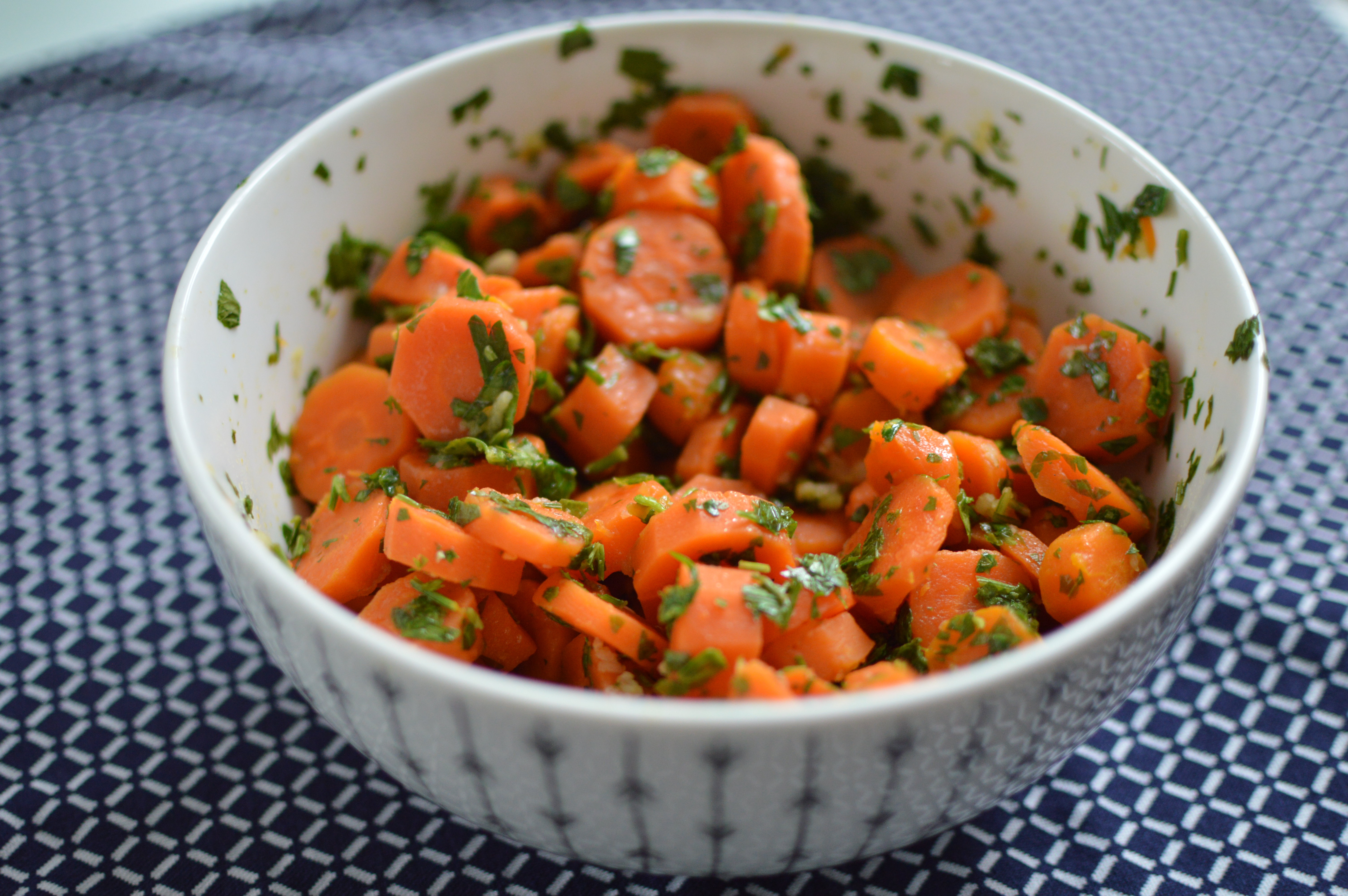 Wenn nötig, Karotten schälen, ansonsten putzen und in Scheiben schneiden. Einen Topf mit Salzwasser zum Kochen bringen und die Karotten darin köcheln, bis sie gar sind, aber durchaus noch bissfest sind. Das Wasser abgießen und die Karotten in einer Schüssel mit einem 1/2 Bund gehackter Petersilie, einem guten Schuss Olivenöl und 2 gehackten oder gepressten Knoblauchzehen vermengen. Mit Salz und Pfeffer nach Belieben würzen. Fertig!