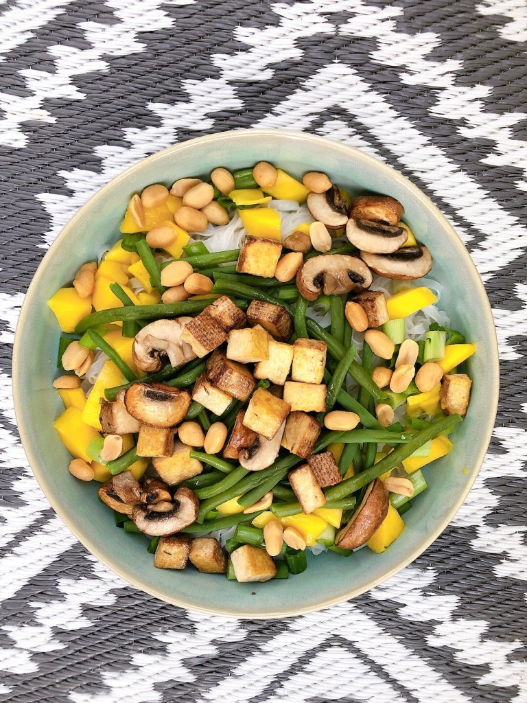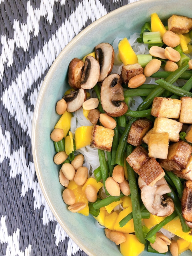 Wenn alles gar ist, die Reisnudeln abgießen und in eine Schale geben. Tofu und Frühlingszwiebel sowie Mango über die Reisnudeln geben. Bohnen ebenfalls abgießen und in die Schüssel geben. Zum Schluss mit Erdnüssen bestreuen und die Sauce drüber geben.