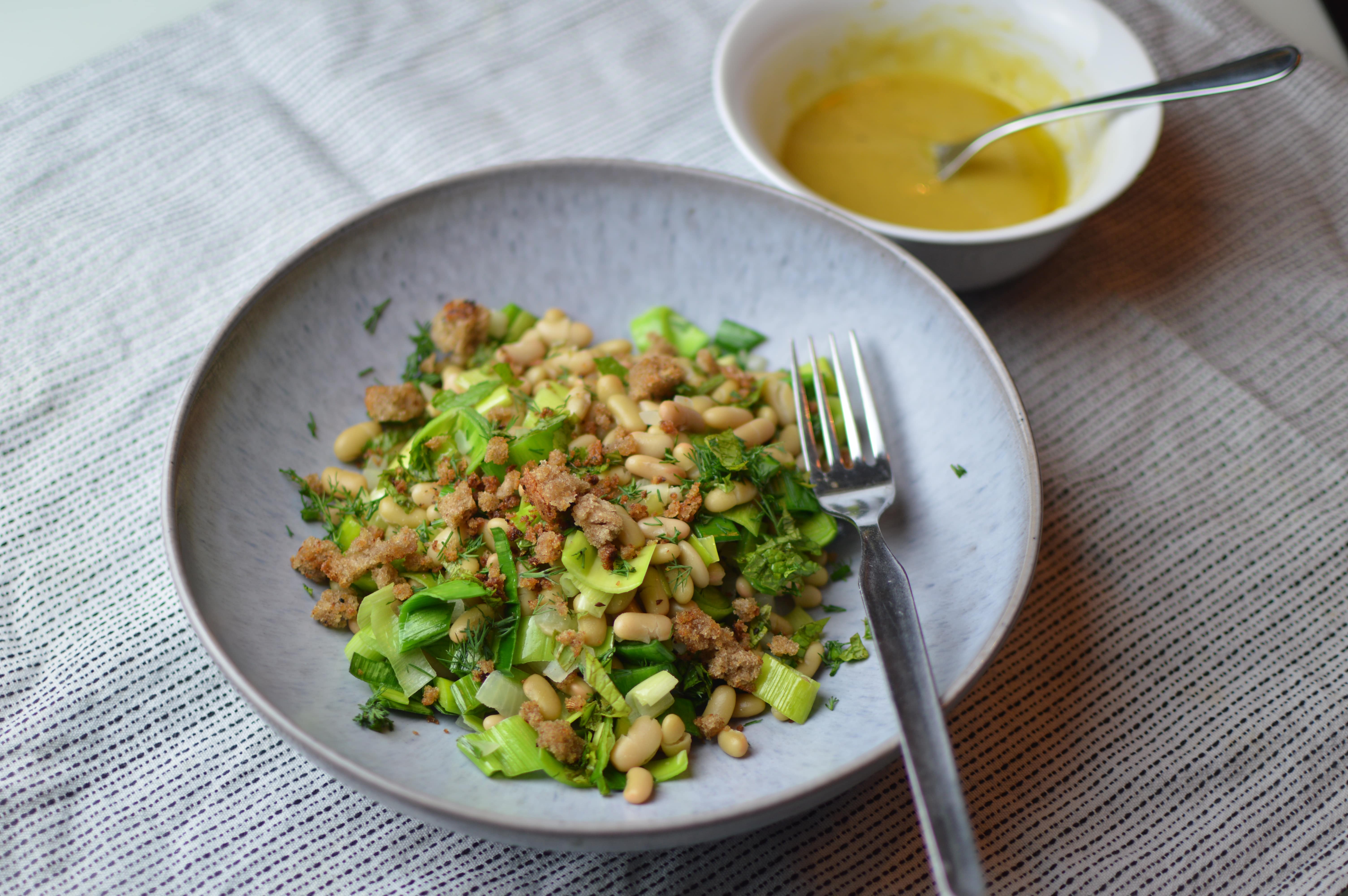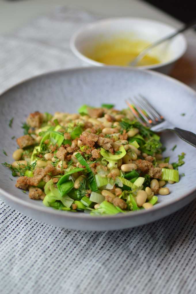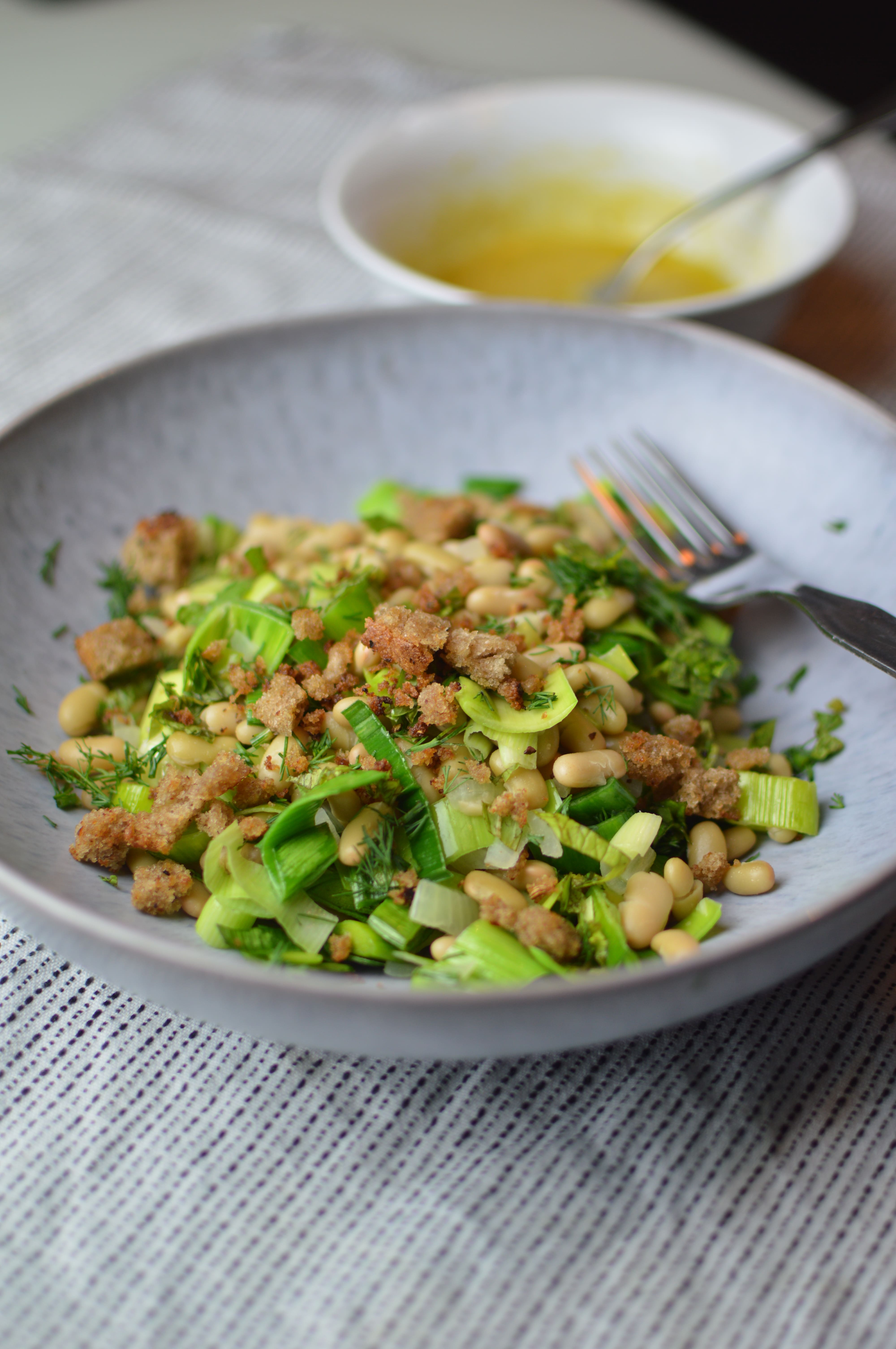 Den Lauch putzen und in Ringe schneiden und dann in etwas Olivenöl (ca. 1 EL) und einem halben Teelöffel Salz in einer Pfanne anschwitzen, bis er weich wird. Die Temperatur runterschalten und die Bohnen zufügen. Regelmäßig rühren, während ihr das Dressing und die Croutons zubereitet.