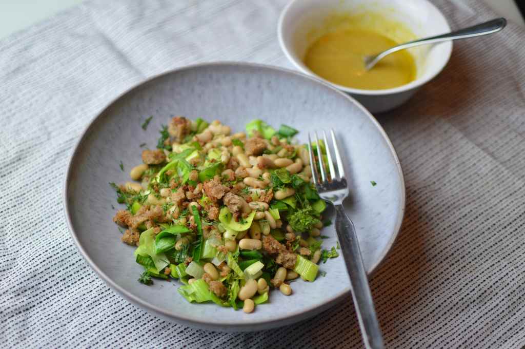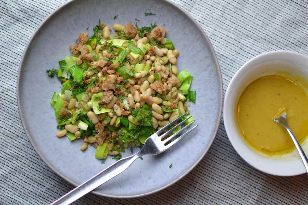 Das Rezept ist jedenfalls super für die kältere Jahreszeit. Schließlich hatten wir immer Sommer genug grüne Salate. Jetzt kommen die Salate, die etwas herzhafter sind und die eher in die Kategorie Wohlfühlküche fallen. Für mich jedenfalls. Dieser warme Lauch-Bohnen-Salat mit Senfdressing gehört für mich jedenfalls dazu.