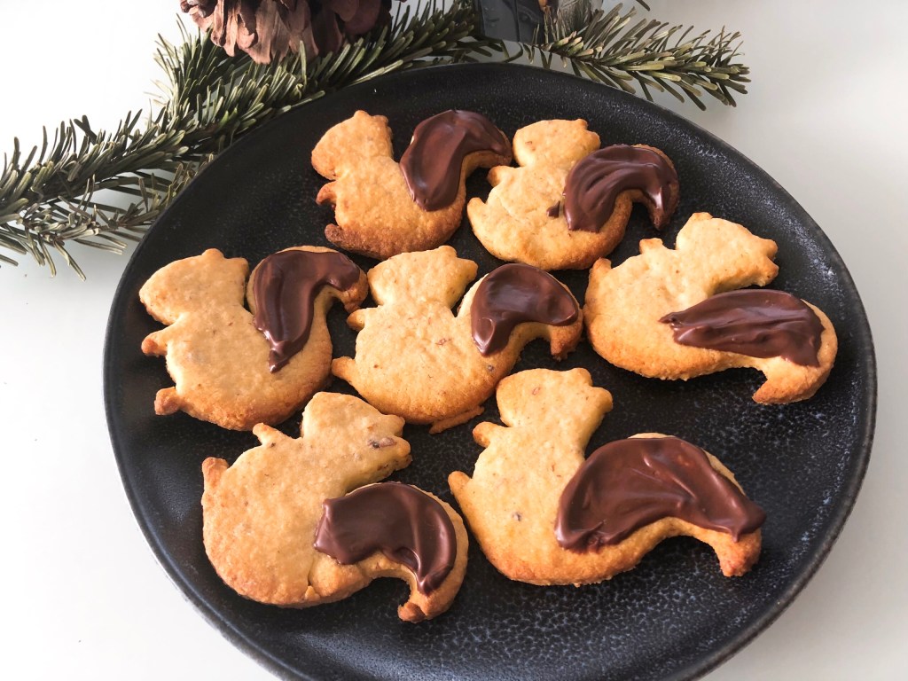 Den puscheligen Oachkatzlschwoaf, wie man in Bayern sagt, habe ich dann noch mit geschmolzener Schokolade versehen, nachdem die Plätzchen abgekühlt waren. Dazu habe ich die Schokolade mit einem kleinen Stück Butter zusammen im Wasserbad geschmolzen, aufgebracht und die Plätzchen dann in ein kühles Zimmer gestellt, damit die Schokolade ja schnell wieder fest wird, damit ich die Plätzchen probieren kann – was soll ich sagen – wir finden sie super. Schön leicht nussige Note, nicht zu süß, perfekt!
