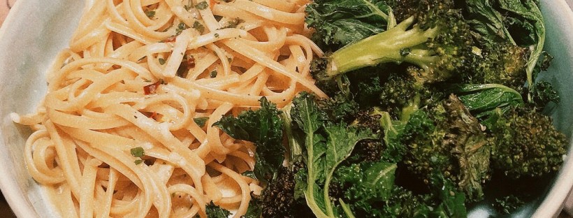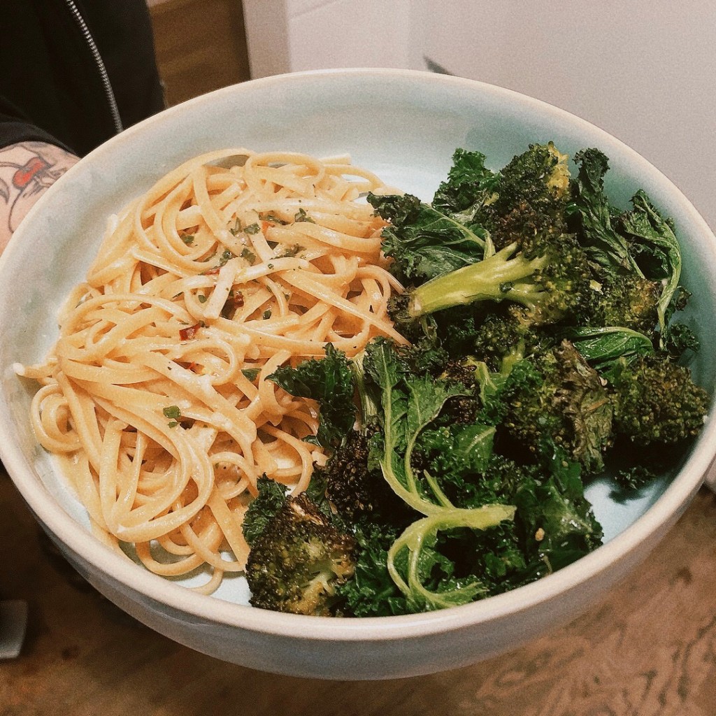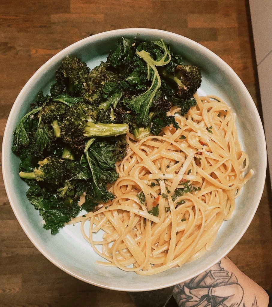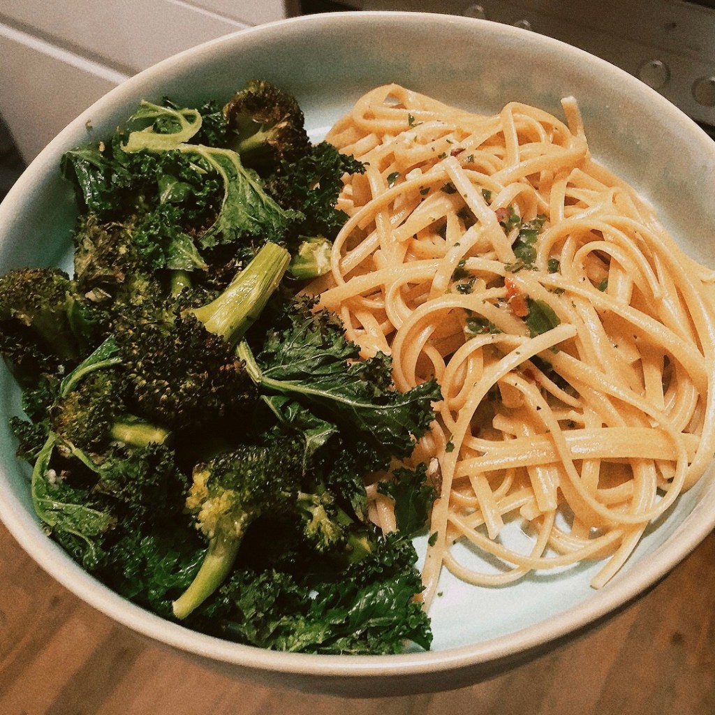 Die Pasta mit dem Brokkoli-Grünkohl-Gemüse aus dem Ofen servieren. Super lecker und aufgrund der große Menge an grünem Blattgemüse auch super sättigend. Denn seien wir mal ehrlich – normalerweise nehme ich viel viel mehr Spaghetti. Aber dies war halt der Rest, der grad noch da war.