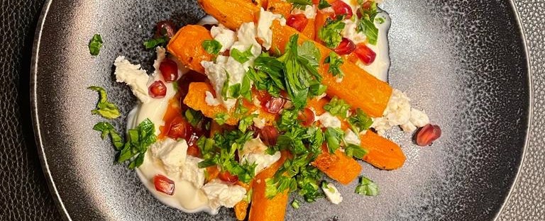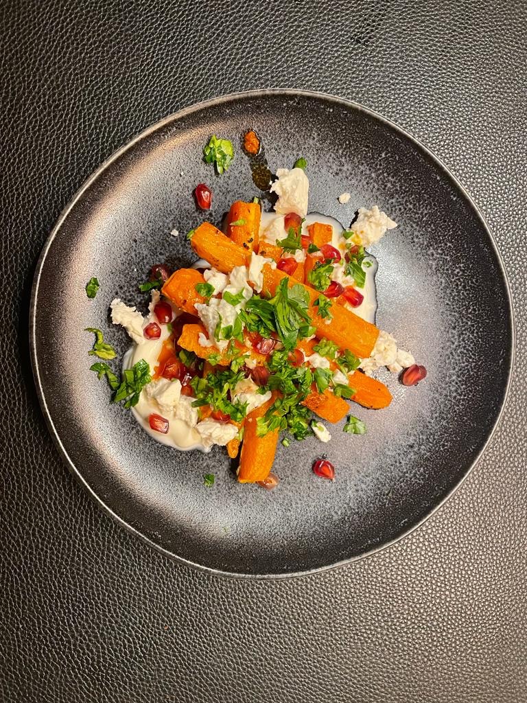 Die Rede ist von ofengerösteten Karotten auf einem Harissa-Joghurt, getoppt mit Granatapfelkernen, Schafskäse und Petersilie. Seien wir mal ehrlich – Karotten spielen in Rezepten doch selten die Hauptrolle. Dabei können sie das richtig gut!