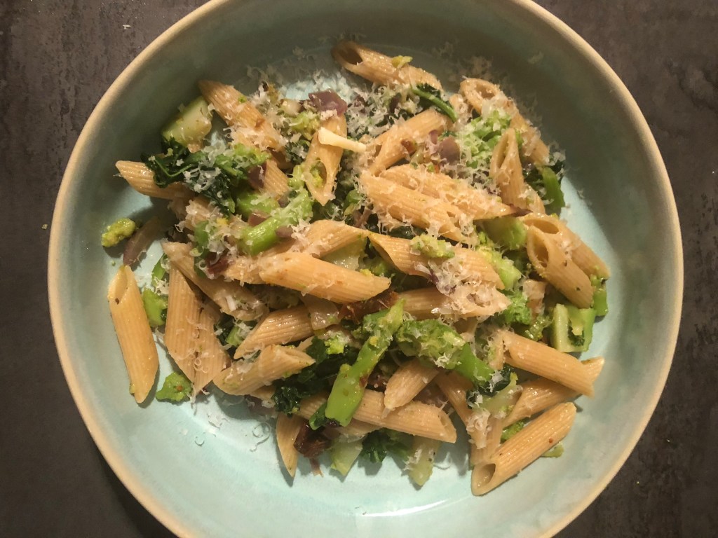Nudeln mit Cima di Rapa in die Pfanne geben, alles gut miteinander vermengen und mit Salz, Pfeffer und Chili würzen. Zum Schluss etwas Zitronensaft drüber träufeln. Wir haben noch Parmesan drüber gegeben. Für eine vegane Variante einfach weglassen.