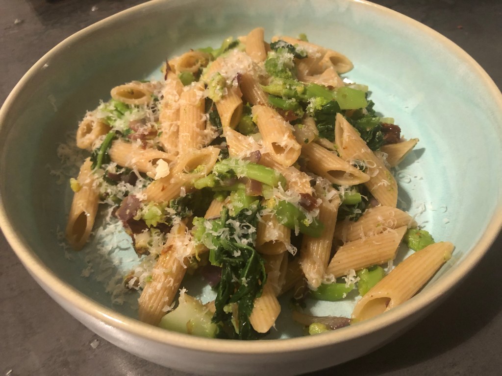 Insofern war es eine aufregende Abwechslung, als ich bei dem Lieferdienst Cima die Rapa gefunden habe. Ich kannte dieses Gemüse bisher nicht. Es handelt sich dabei um einen Stängelkohl, der viel in Italien gegessen wird und in Apulien sogar als Nationalgericht gilt. Cima di Rapa gehört zu den Kreuzblütlern und ist eine Kreuzung aus Rübe und Brokkoli.