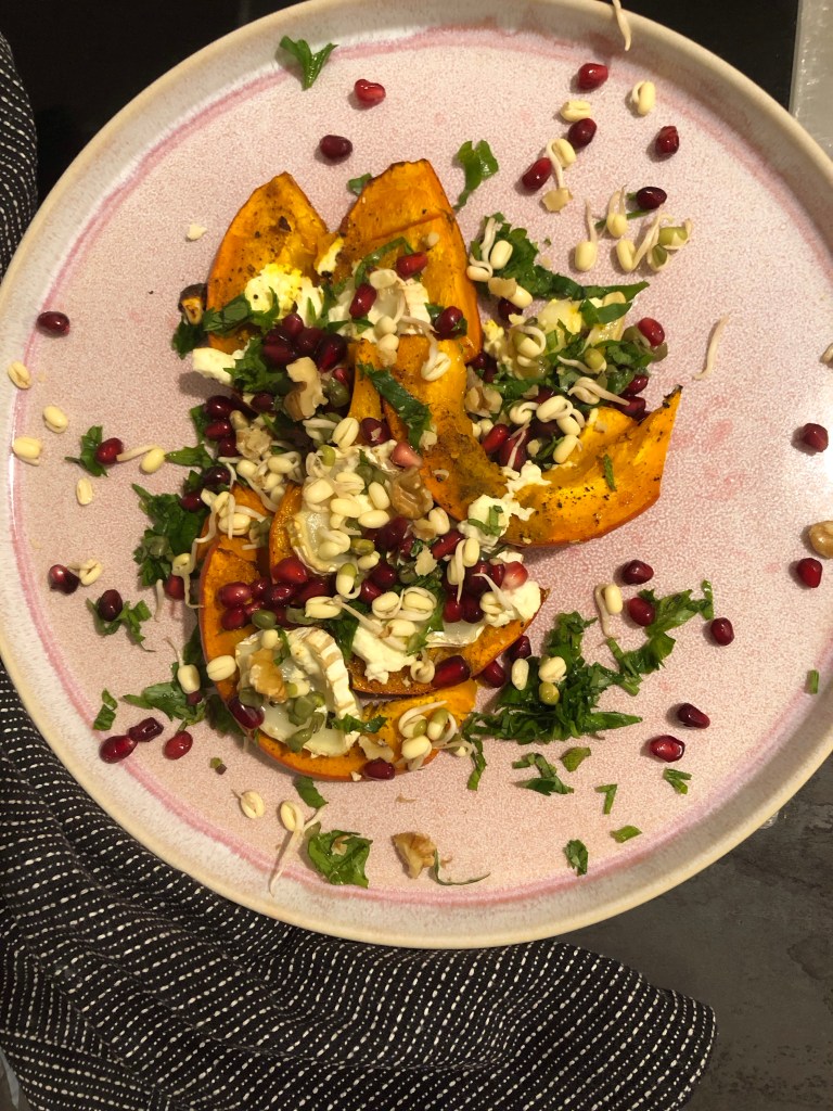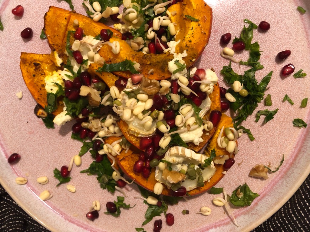 Wenn der Kürbis und der Ziegenkäse fertig sind, diesen auf eine Servierplatte oder einen grossen Teller legen, Granatapfelkerne, Walnüsse, Petersilie und Sprossen drüber geben und fertig ist der Lack.