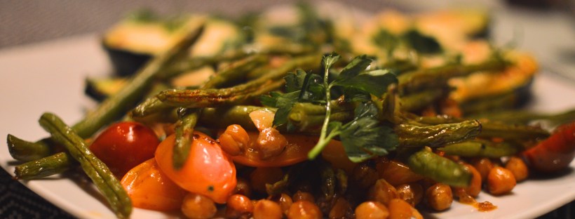 Überbackene Zucchini mit grünen Bohnen, Tomaten und Kichererbsen
