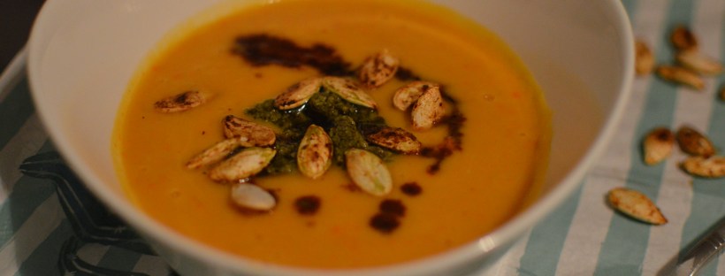 geröstete Kürbissuppe mit Pesto und Kürbiskernen